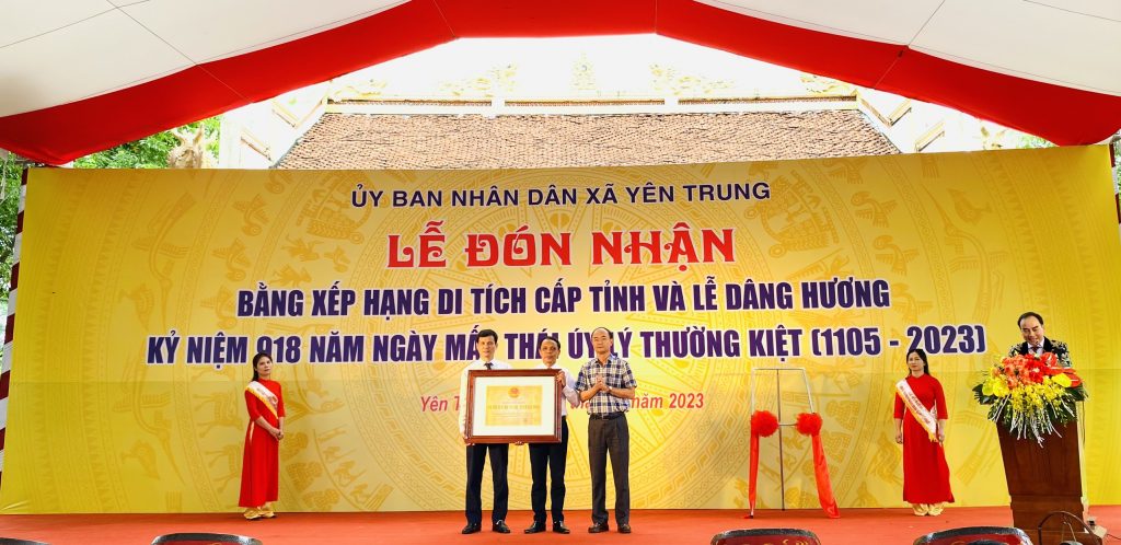 Thừa ủy quyền của lãnh đạo UBND tỉnh, đồng chí Đỗ Quang Trọng, Phó Giám đốc Sở Văn hóa, Thể thao và Du lịch đã trao Bằng xếp hạng di tích cấp tỉnh Đền thờ Thái úy Lý Thường Kiệt cho xã Yên Trung.
